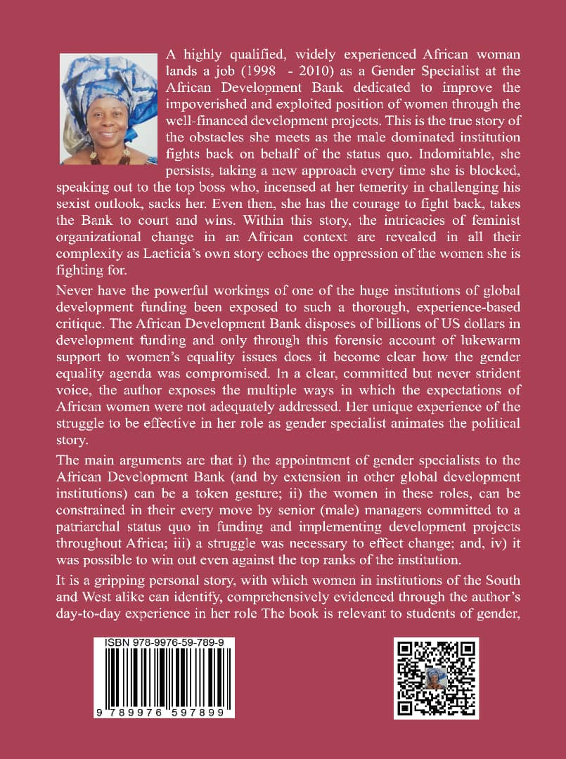 This is not just a book about laeticia struggle as a gender specialist at the African Development Bank but rather an analysis of how far we have come in implementing the gender agenda . It is not a throw of tantrums by an angry woman but a well researched and well put account on gender mainstreaming and the problems faced by women at the workplace everyday with proposed solutions and ways to accelerate the process by starting having true intentions and political will to do the same.